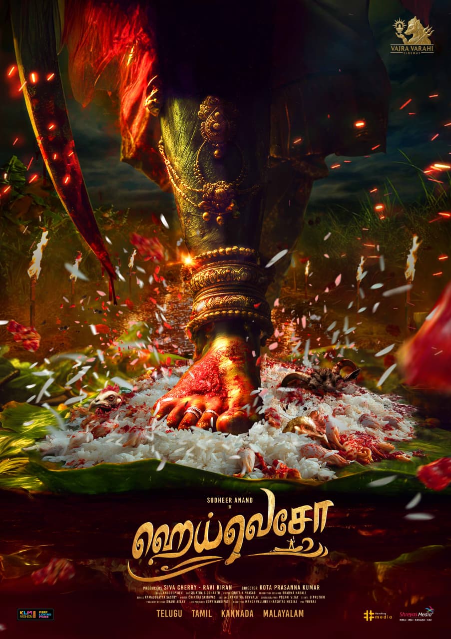 The title poster adds a mythological and rustic tone. It features a regal foot adorned with golden anklets and toe rings, stepping onto a large green leaf. On the leaf lies a traditional offering of cooked rice mixed with hen and goat heads, flowers, and sindoor, representing rituals and sacrifice. A blood-soaked sword heightens the drama, hinting at divine power and conflict. The title poster alone indicates the intense nature of the story.
